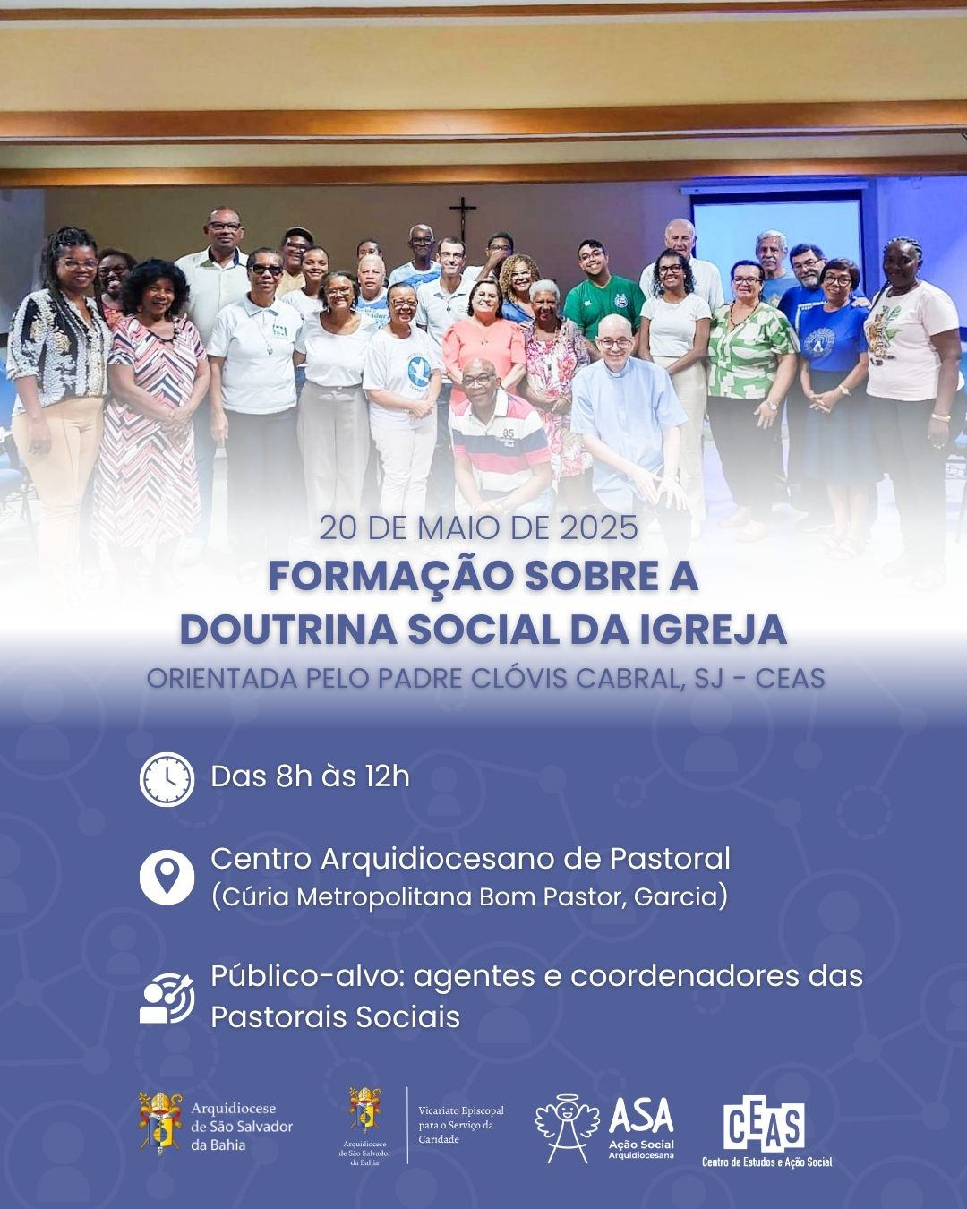 Promovido pela Arquidiocese de São Salvador da Bahia, por meio do Vicariato Episcopal para o Serviço da Caridade, com apoio da Ação Social Arquidiocesana (ASA) e do CEAS, o encontro busca fortalecer a atuação dos agentes pastorais que, diariamente, se dedicam à construção de uma sociedade mais justa, fraterna e solidária, em sintonia com os valores do Evangelho.